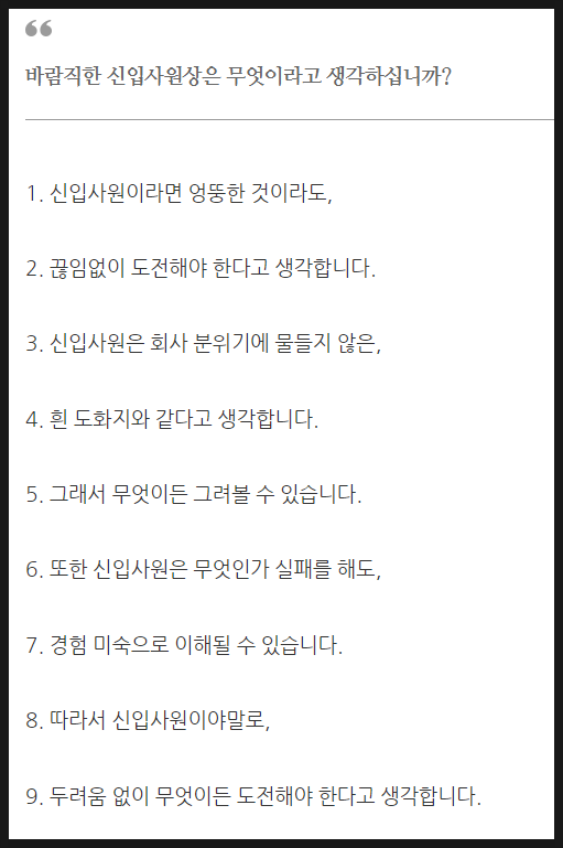 위 질문처럼 "바람직한 신입 직원상은 무엇입니까?" 혹은